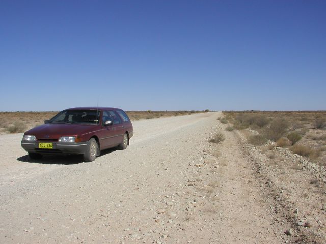 Vi valgte at tage bagvejen til Coober Pedy. Det er for det meste grusvej og vi kom virkelig langt ud på landet, hvor firhjulstrækkerne altid har 2 reservehjul med. Nu har vi jo kun tohjulstræk, så vi mente at vi kunne klare os med 1. Heldigvis kom vi igennem uden punkteringer. Vi kunne ikke have kørt denne vej igennem, hvis der havde været regnvejr for nylig, da man mange steder skulle krydse vandløb og floder.