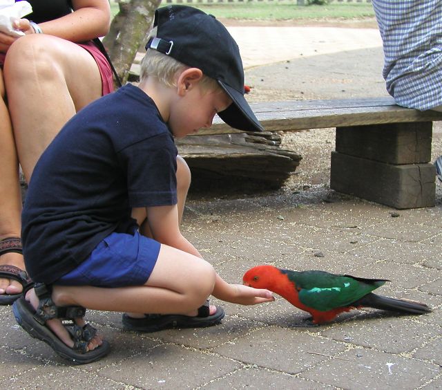 Lars fodrer også en King Parrot. Hannerne har rødt hovede, mens hunnerne har grønt hovede.