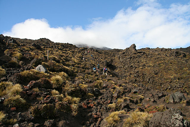 Selvom der er blå himmel, ligger der skyer om vulkantoppene.